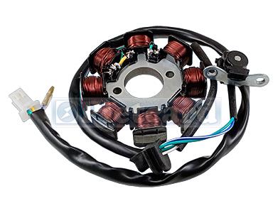 Estator monofásico de 8 polos con conexión a masa. // Diámetro Interior: 29.00 mm / Diámetro Exterior: 93.00 mm / Distancia entre centros de agujeros: 41.00 mm / Altura Núcleo: 24.50 mm. Sensor código 3064.
